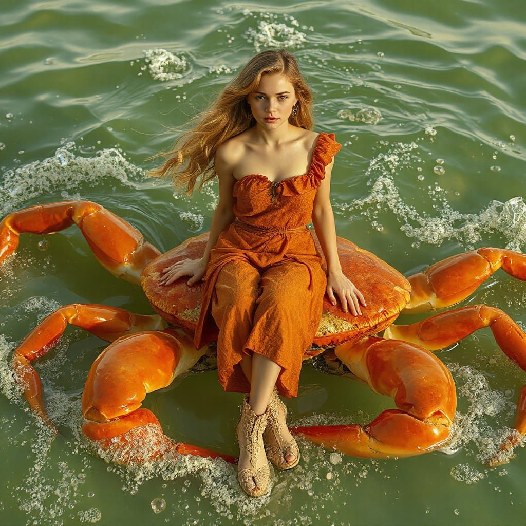 This image shows a woman with golden hair on a giant gummy crab in a soda ocean of amber and tangerine hues. The art style is whimsical and detailed, evoking wonder.