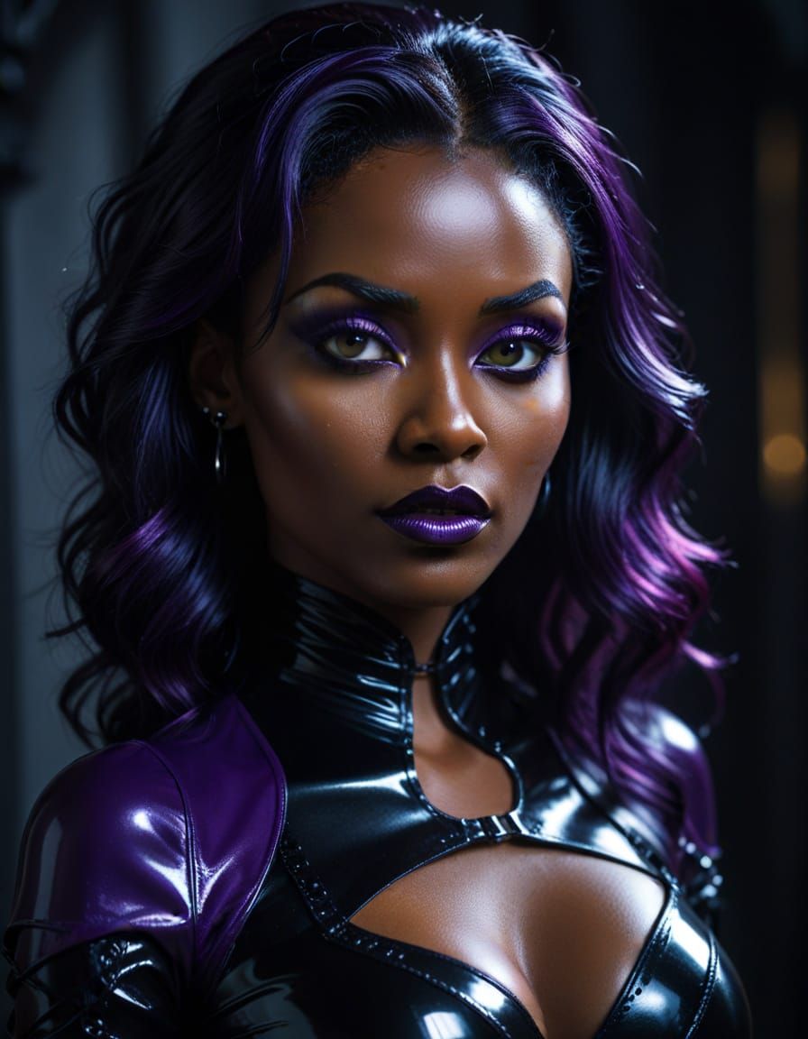 A close-up gothic portrait of a busty ebony woman in latex. Features low-key lighting, vibrant dark colors, and dramatic shading for a mysterious, luxurious look.