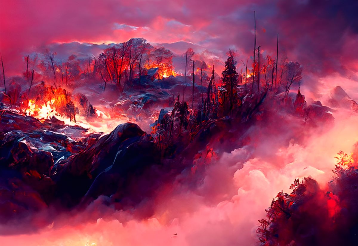8K 3D, 8k resolution, DSLR, Flickr, matte painting, Terragen; photography; landscape; brightly illuminated; water color scheme. Raging fires, deviantart detailed painting