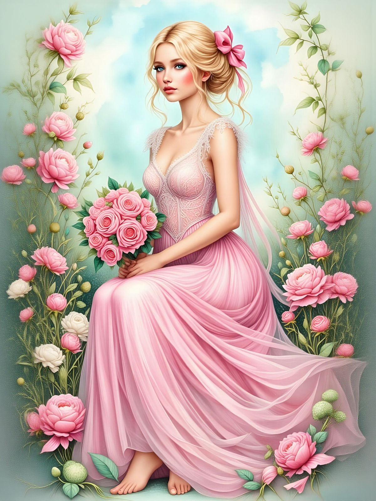 This image shows a beautiful 25-year-old woman with blonde hair and blue eyes holding pink roses in a summer meadow. She is wearing a long pink and white lace dress in a watercolor aesthetic.