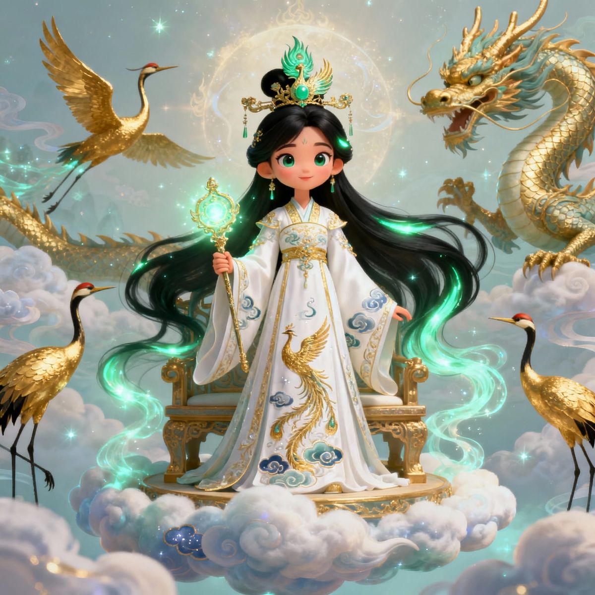 This image depicts a young Jade Empress of Heaven on a cloud throne, wearing a white and gold hanfu. She holds a jade scepter, surrounded by celestial dragons and cranes, in a fairytale fantasy setting.