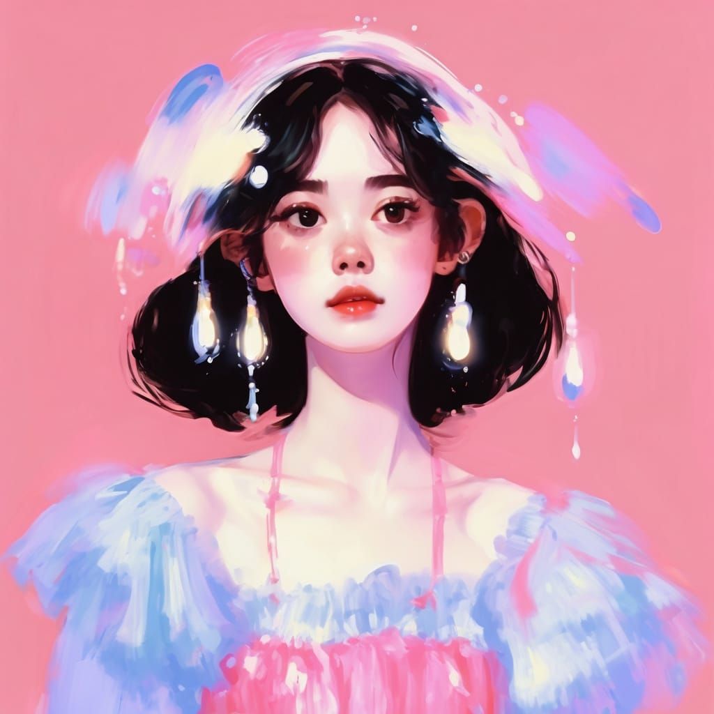 Aesthetic illustration of a girl with straight hair and a petticoat dress, rendered with impressionist brushstrokes and oil paint textures. Features wet, dome-like eyes with subtle highlights.