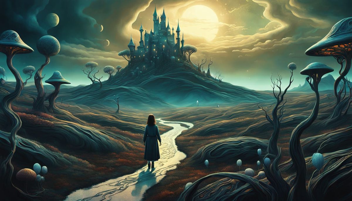 A striking picture of a woman holding a child's hand in a surreal landscape. The scene features intricate details and dark fantasy elements in a Moebius-inspired style.