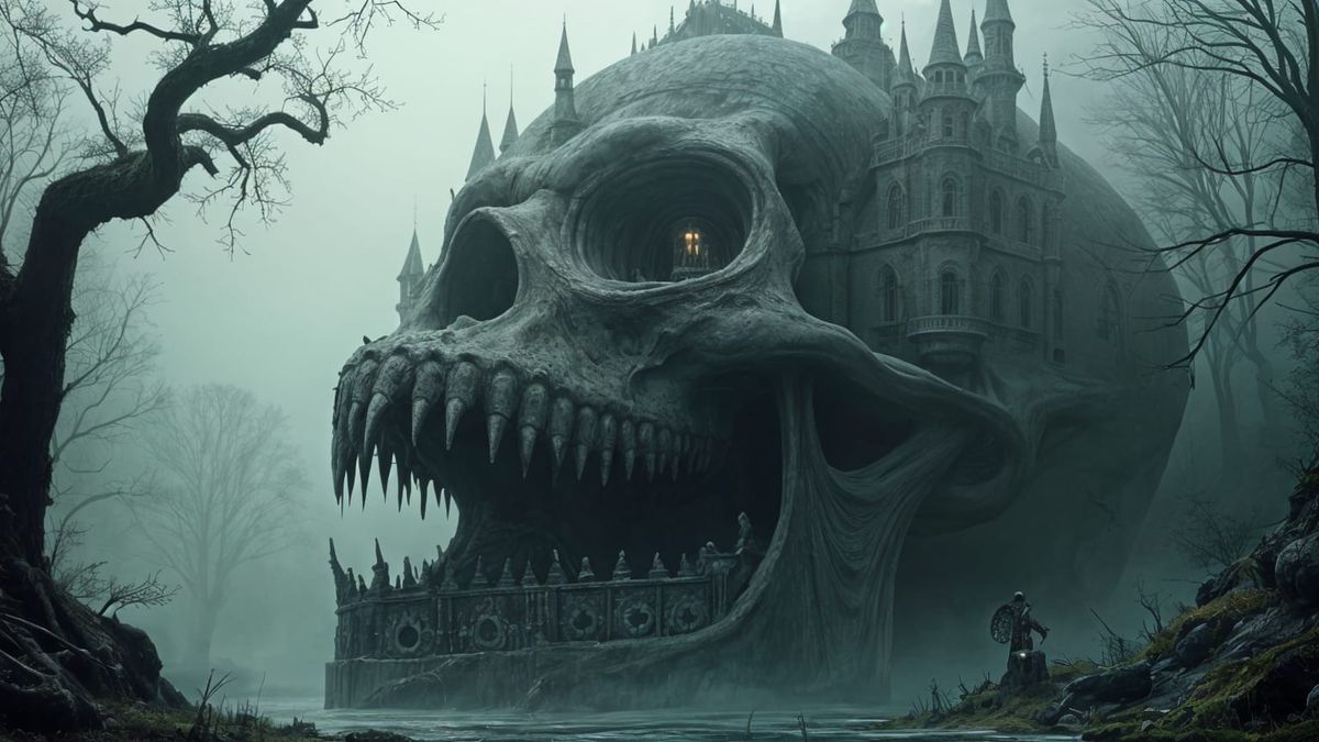 This image shows a haunted castle situated within the jaws of a giant skull, set amidst a mysterious and ominous swamp. The artwork features intricate, biomechanical details reminiscent of late 19th-century Gothic art.