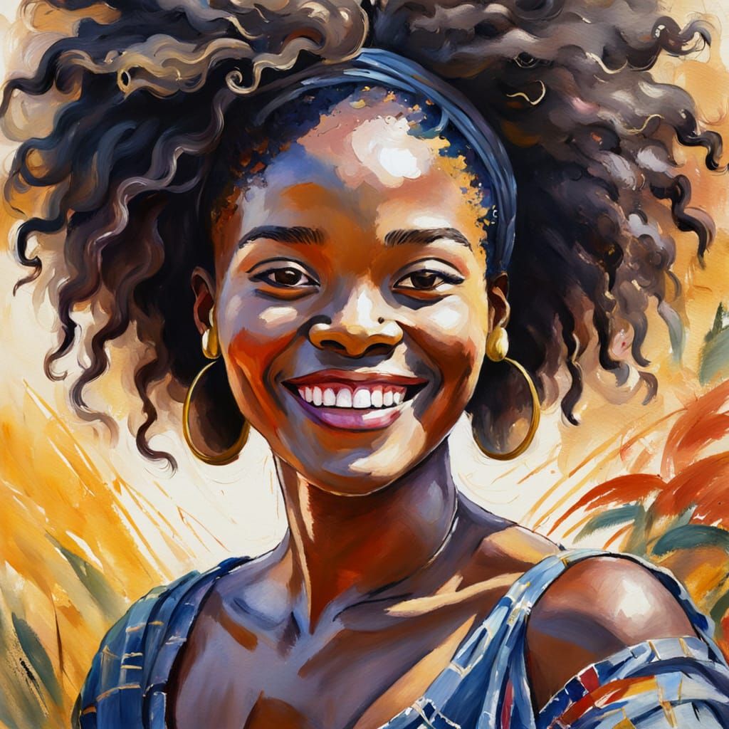 A close-up of a beautiful African woman smiling, created as an impressionist gouache and watercolor painting. The artwork features thick brushstrokes, vivid colors, and golden lighting in a maximalist style.