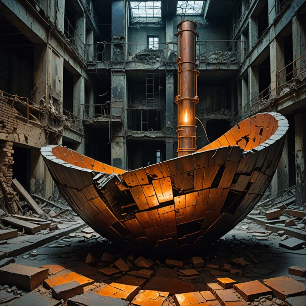 A close-up image showing broken brick and copper pipes in glass. The surreal art features viscous textures, industrial decay, and bioluminescent accents in dark, muted colors. The piece is reminiscent of brutalist architecture.