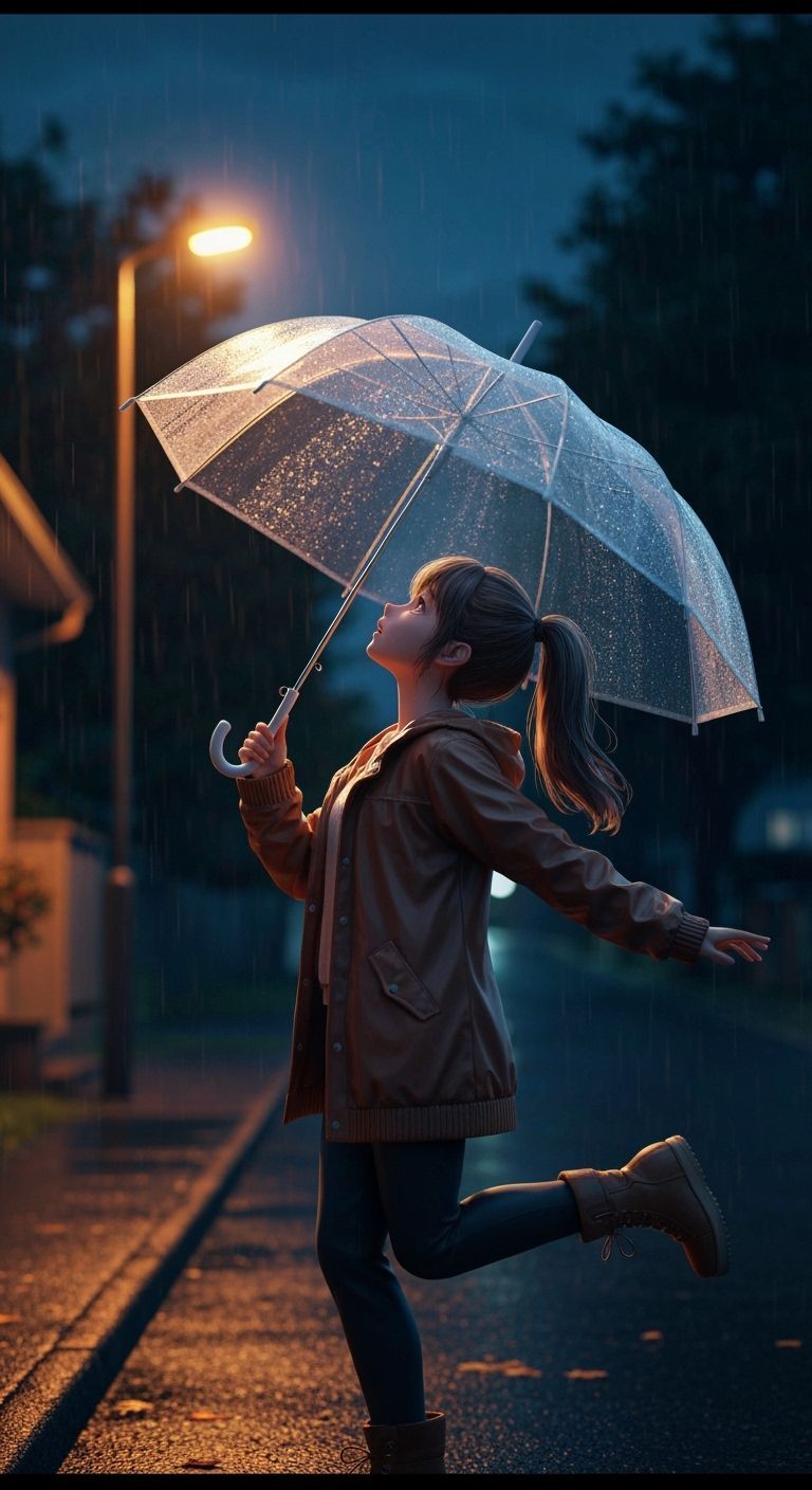 A cinematic film still captures a teen girl dancing in the rain on a suburban street, looking up at raindrops. Cozy, atmospheric, hyperrealistic with bokeh and dramatic lighting.
