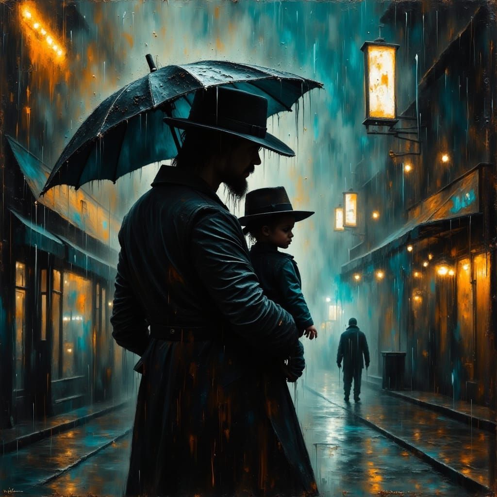 A woman in a fedora stands silhouetted against a neon-lit, rainy cityscape. The scene evokes a noir atmosphere with dramatic contrasts and painterly textures, creating a dreamlike urban quality.