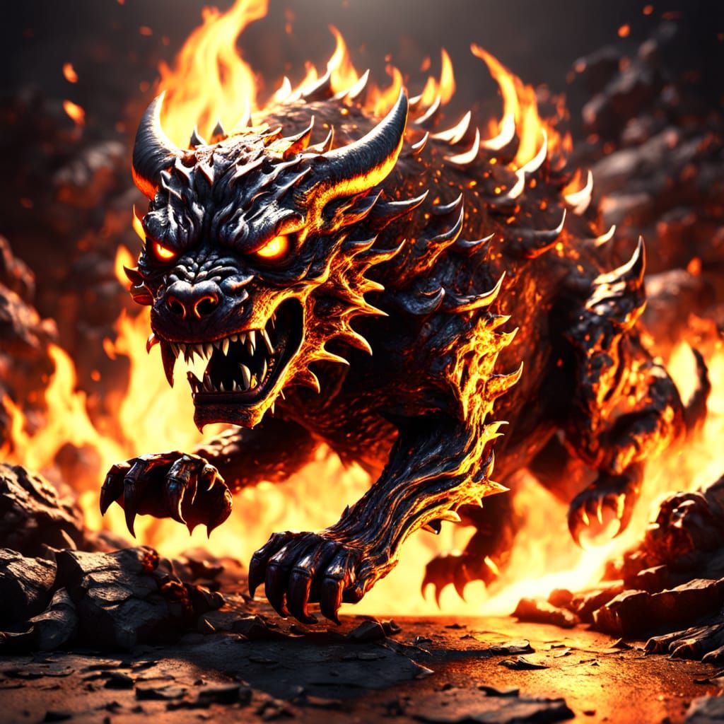 This image shows a close-up of a snarling demon dog bursting through a wall, with a raised, golden font logo reading 'Danger doggy' and surrounded by glowing molten lava and strong shadows.
