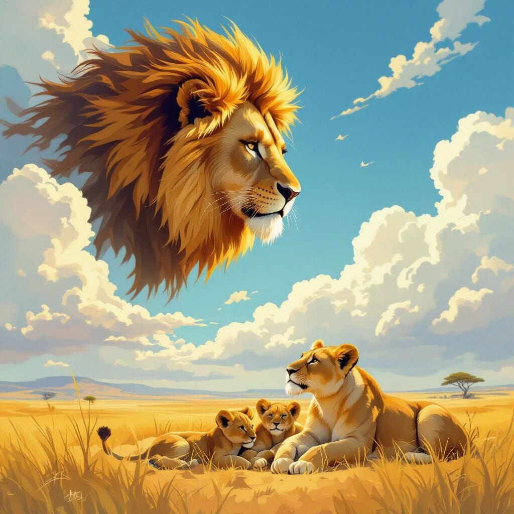 This image shows a lion's spirit watching over a lioness and her cubs in the Serengeti. The stylized realism and atmospheric perspective create a heartwarming scene.