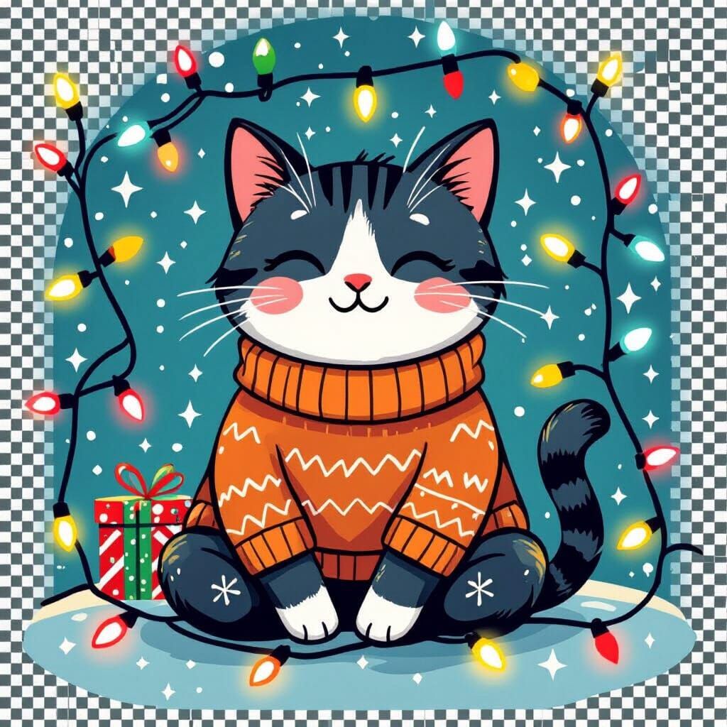 A charming image of a contented cartoon cat wearing a sweater while surrounded by colorful Christmas lights. The vector illustration features bold lines and holiday colors in a whimsical style.