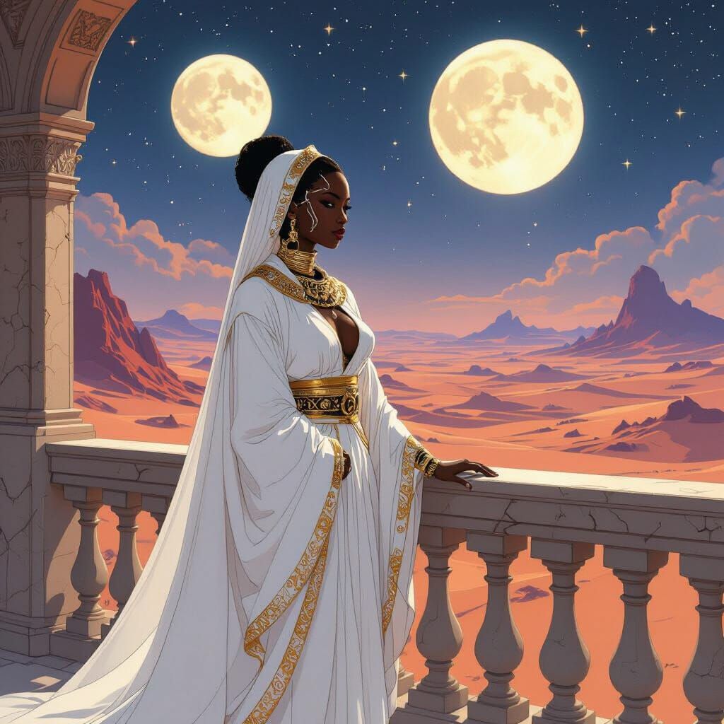 A striking picture of an elegant woman with golden facial markings, standing on a balcony. She overlooks a surreal, otherworldly desert landscape with twin moons and glowing nebulae, rendered with ethereal fantasy elements.