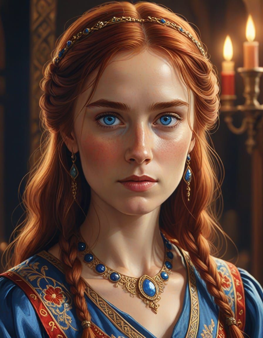 A digital painting of a House Tully woman in a medieval portrait. The woman has auburn hair, blue eyes, and wears a silk tunic with embroidery, depicted with a warm color palette.