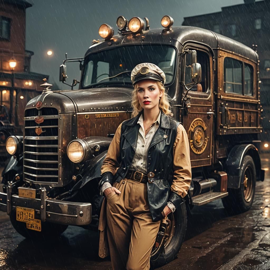 This image shows a blonde female truck driver in front of a vintage steampunk-style truck on a dark, rainy night. The scene is depicted with rich colors and a retro aesthetic.