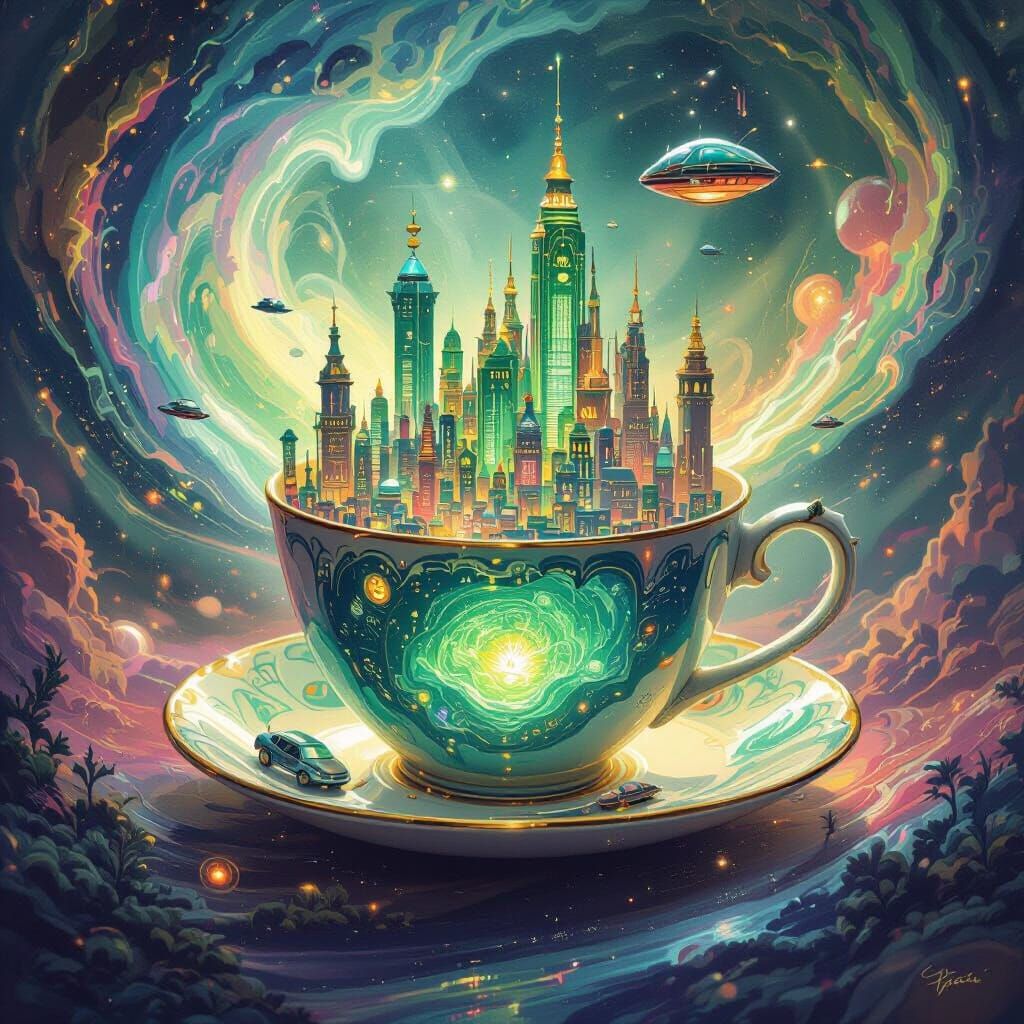 A vibrant image of a teacup containing a miniature alien city. Bioluminescent buildings and hovering vehicles are surrounded by swirling tea in a surreal, fantastical style.
