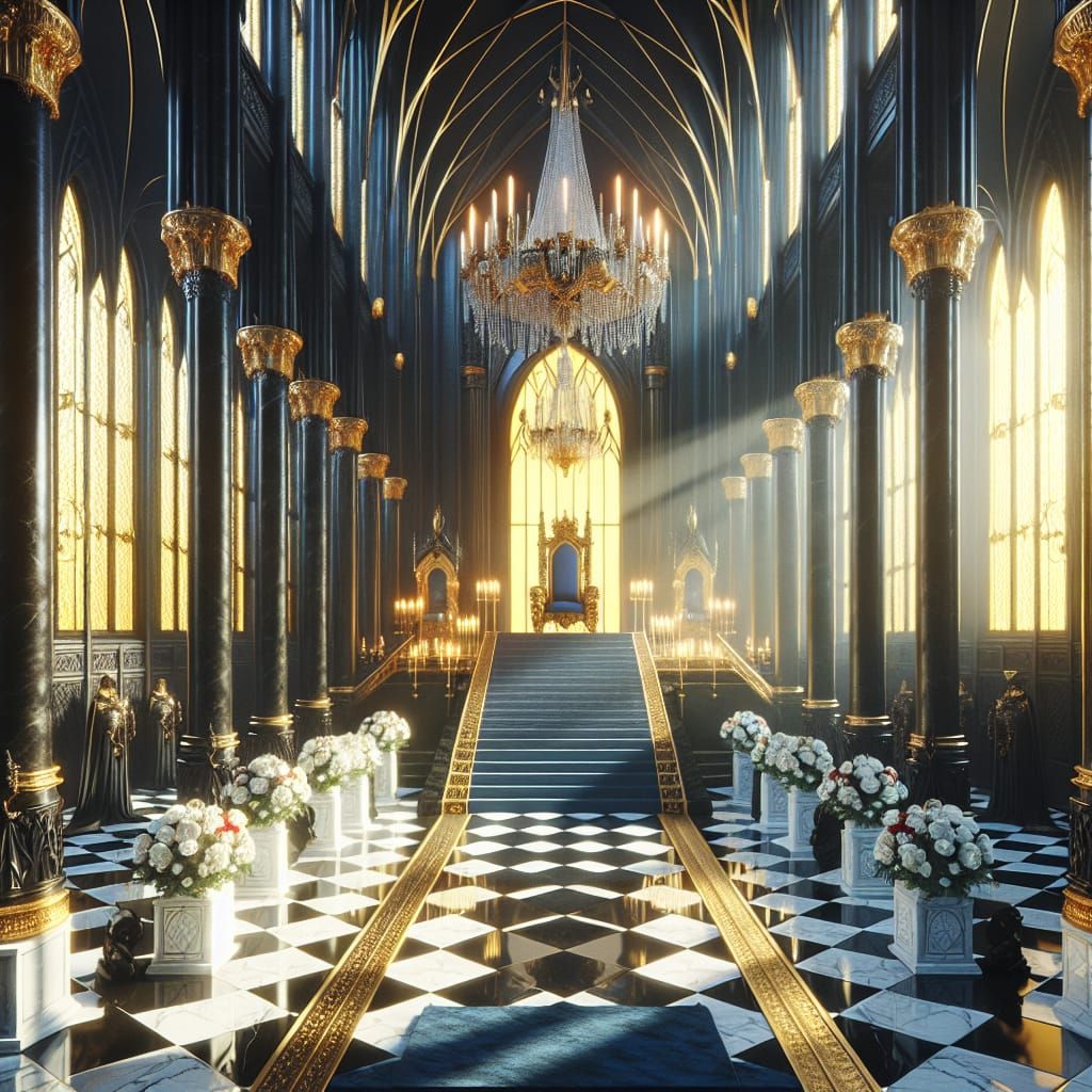 This fantasy concept art features a black marble castle interior with four pillars and hanging chandeliers. A golden throne sits on a chequered floor with a velvet carpet.