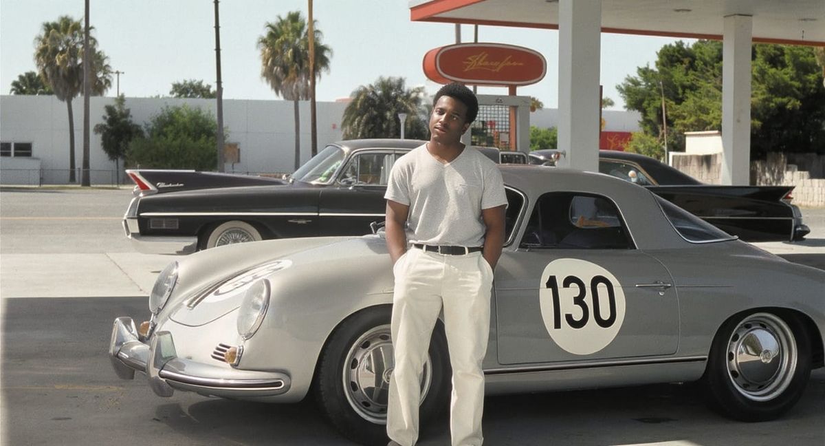 This image captures a man in his twenties standing next to a Porsche 550 Spyder at a gas station with a Cadillac in the background. The scene is reminiscent of mid-century photography with muted colors.