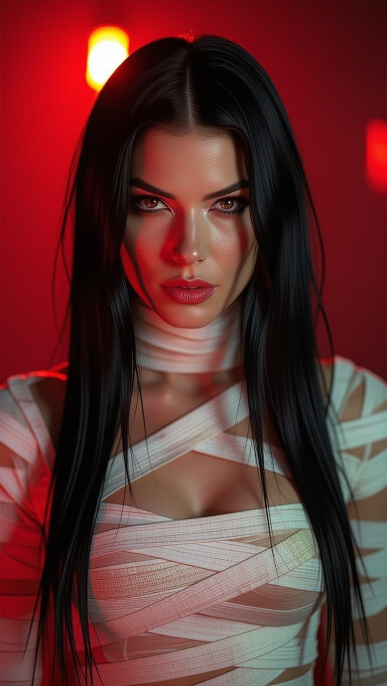 Jennifer Carpenter with Black hair, Fighting in an Egyptian Mummy costume. seen standing full height