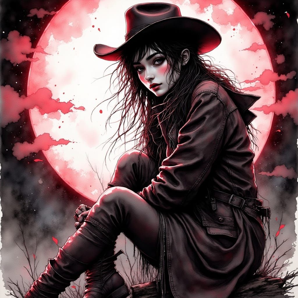 A striking picture of a young Japanese woman in silhouette, holding a knife under moonlight. The image is rendered with surreal watercolor and ink crosshatching in a dramatic style.