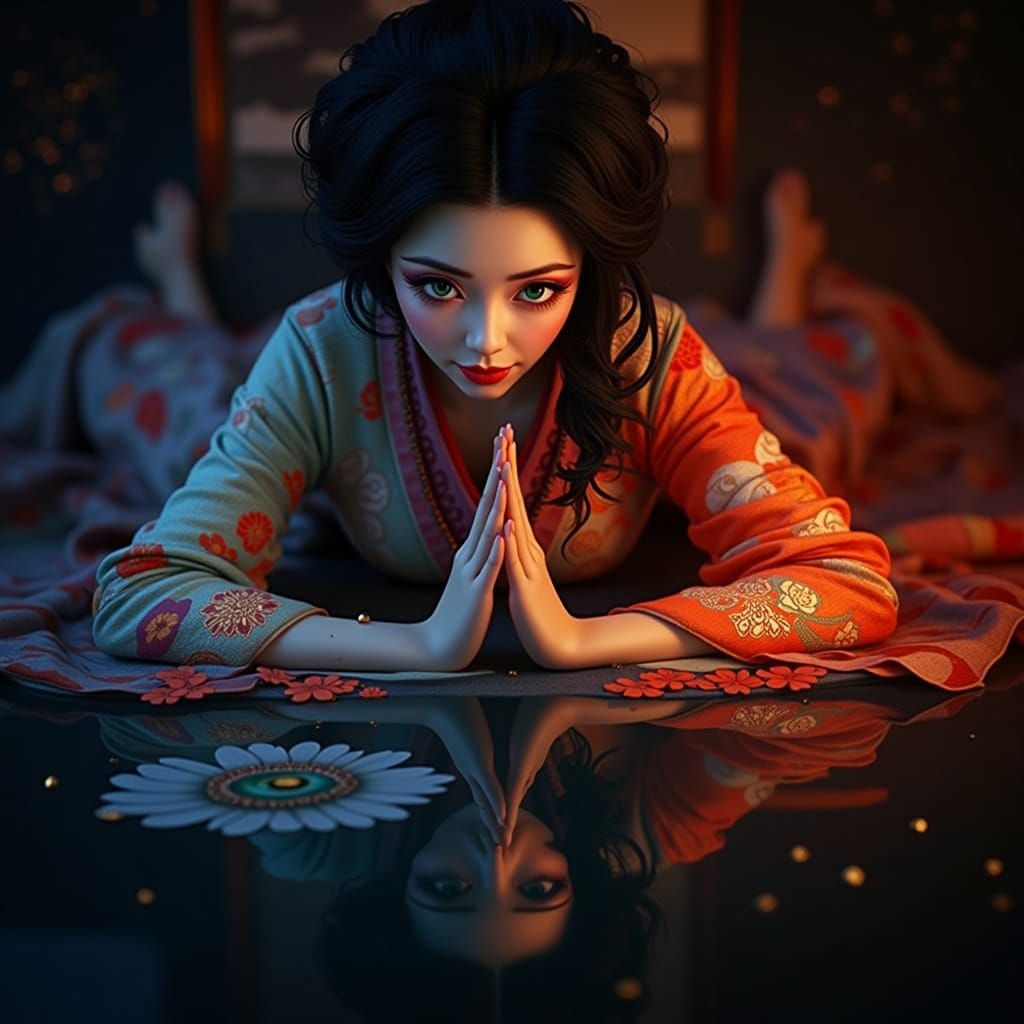 This image shows a close-up, hyperrealistic portrait of a beautiful geisha with black hair and green eyes. She wears an elaborate dress with golden motifs and touches a mirrored reflection against a cosmic background.