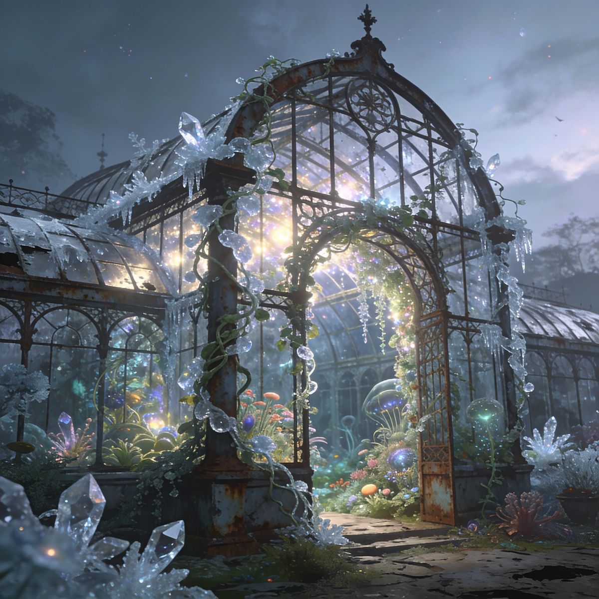 This image shows a Gothic Victorian greenhouse ruin transformed into an alien jungle portal. Crystal vines and glowing flora merge with rusted iron, blending architecture with vibrant extraterrestrial life in a fantasy illustration style.