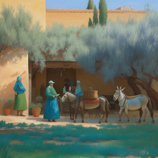 A vibrant image of women harvesting olives near a Moroccan village. The scene features warm lighting, blue buildings, and lush green trees, rendered with soft brushstrokes in an impressionist style.