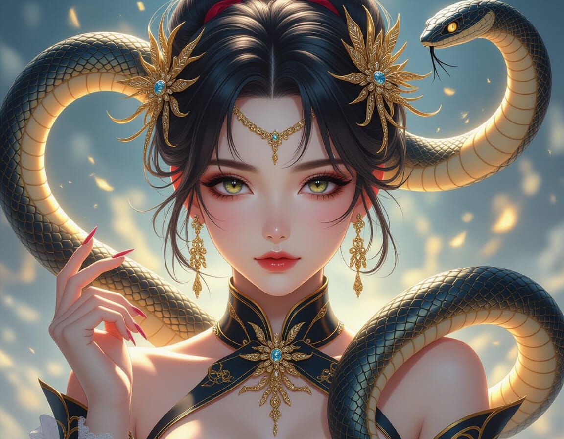 This image shows a beautiful anime villain with a delicate snake. The digital artwork features fantasy realism and chaotic energy with gold colors. It's a high-quality CGI rendering with dramatic lighting.