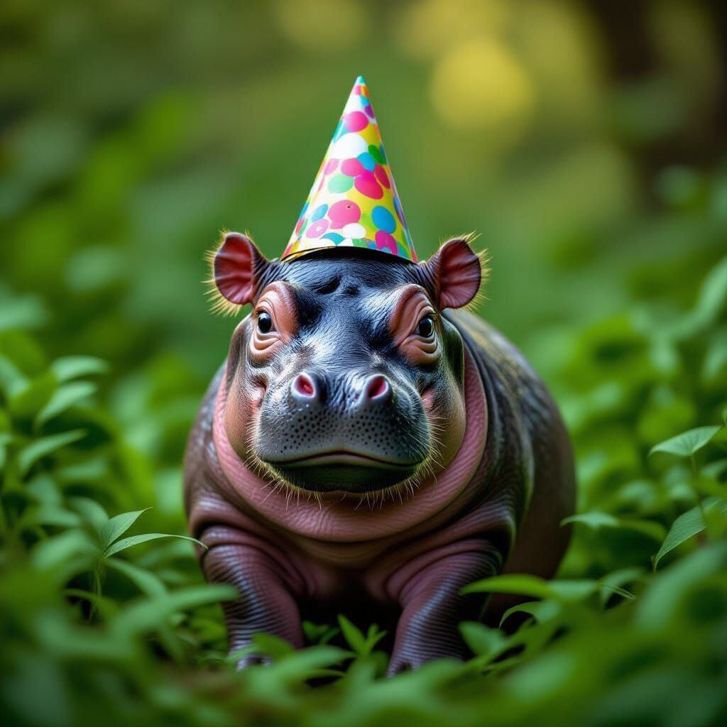 A hyperrealistic image of a one-year-old female Pygmy hippopotamus wearing a party hat in Thailand. The photo features sharp focus and cinematic lighting, set against lush greenery.