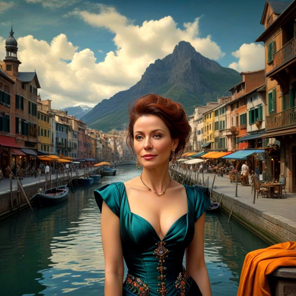 photorealistic gorgeous 55-year-old lady in a beautiful complex fantastic scene, elegant flamboyant extravagant outfit, vibrant luminous colors, intense contrasting colors, sharp focus, great focal depth, highly detailed, high definition, ultra quality, intriguing, fascinating, riveting, tantalizing, ...