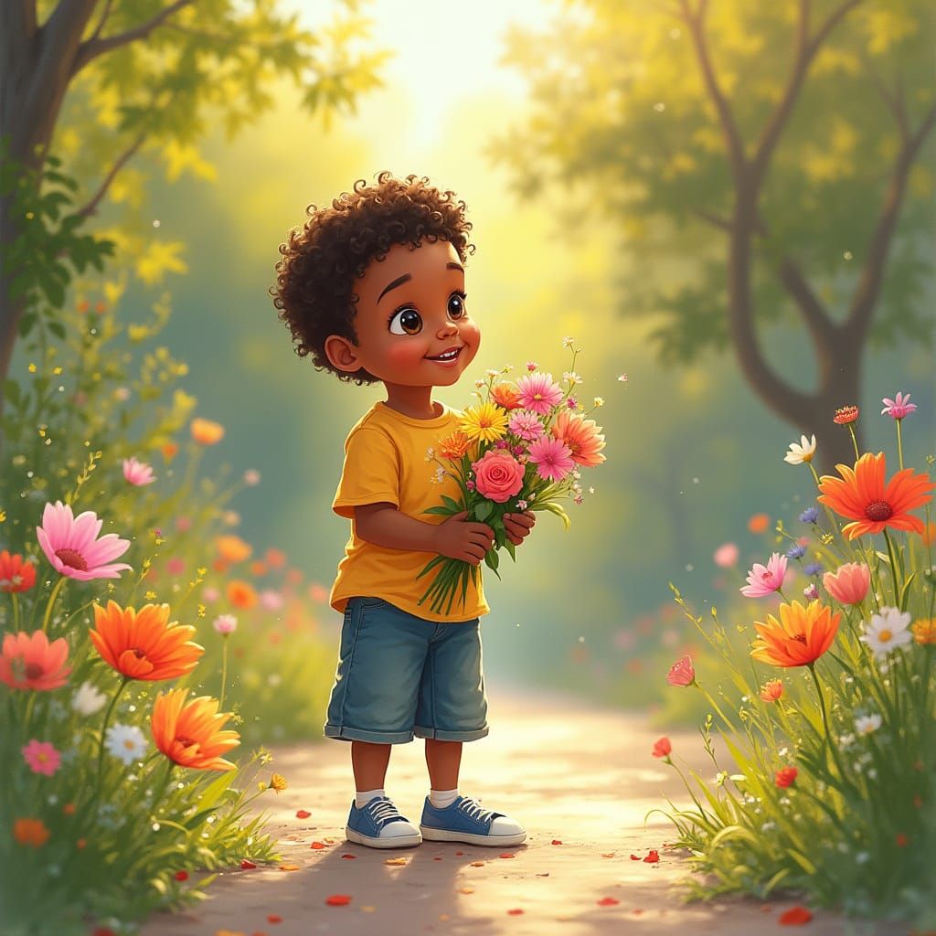 A heartwarming image of a young boy giving colorful flowers to his mother on a sunny Mother's Day morning, captured in a lively impressionist style with soft brushstrokes and gentle lighting.