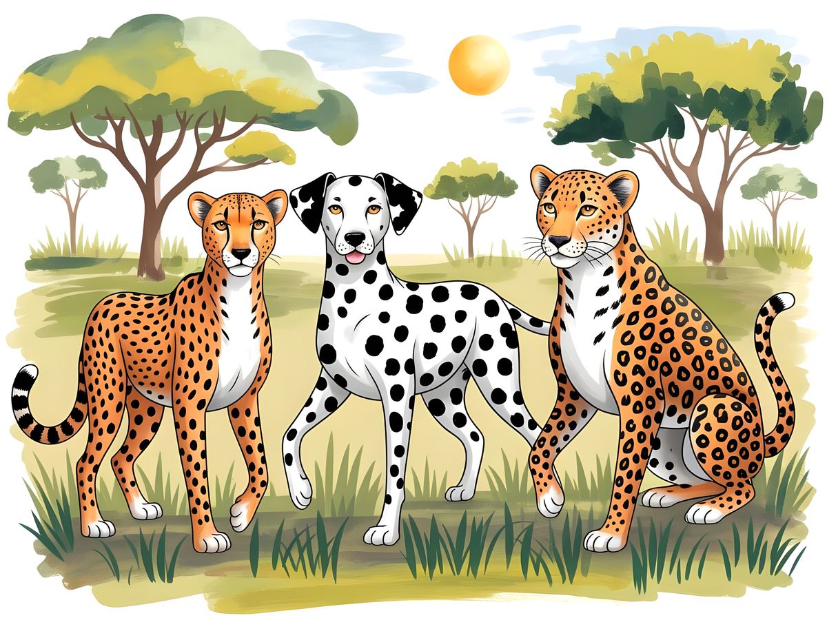 A colorful scene of a cheetah, dalmatian, and leopard walking together in a sunny safari. The artwork is reminiscent of watercolor paintings with a whimsical style.