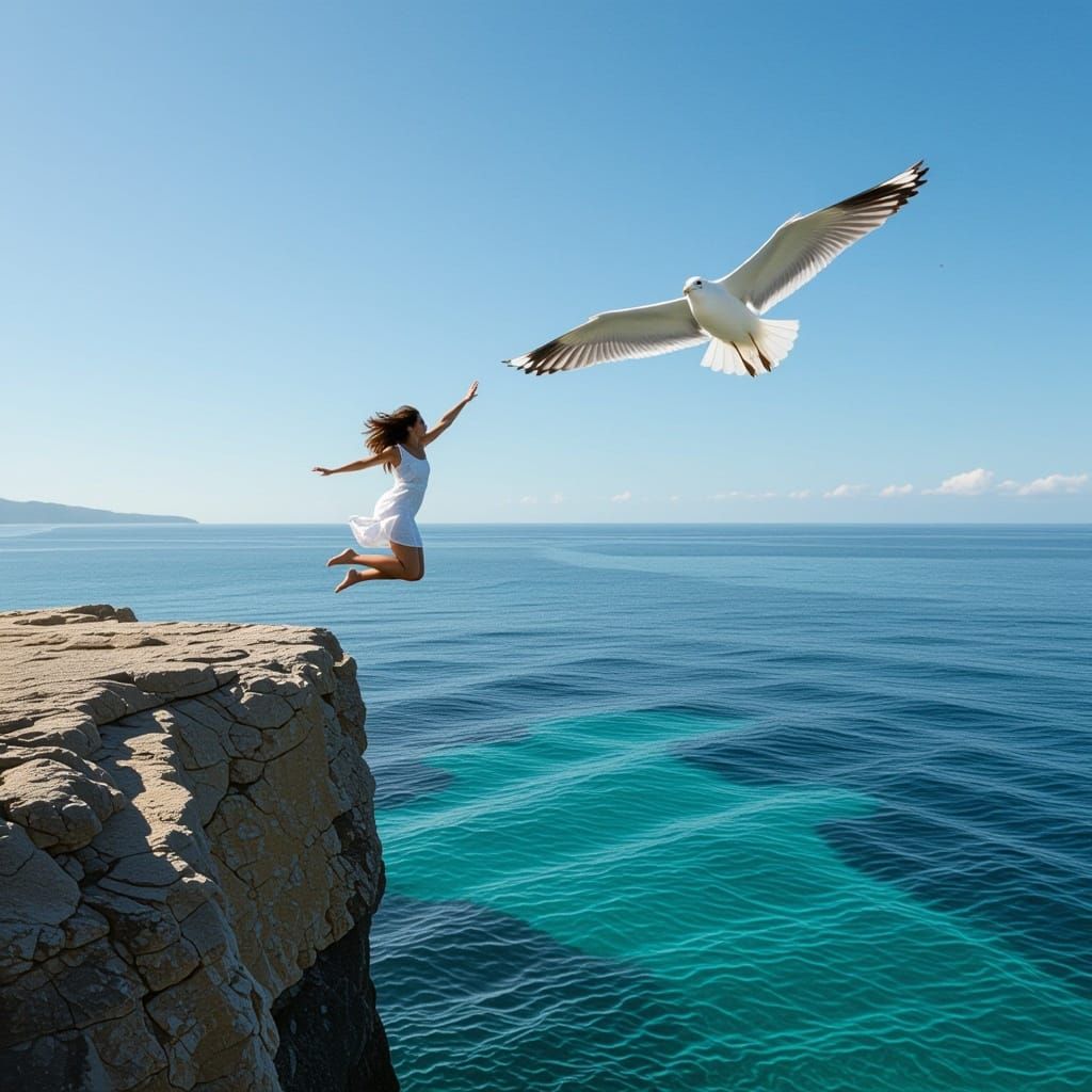 A surreal image of a woman transforming into a seagull, flying towards the sky above the deep blue sea, captured in a fantastical and dreamlike atmosphere.