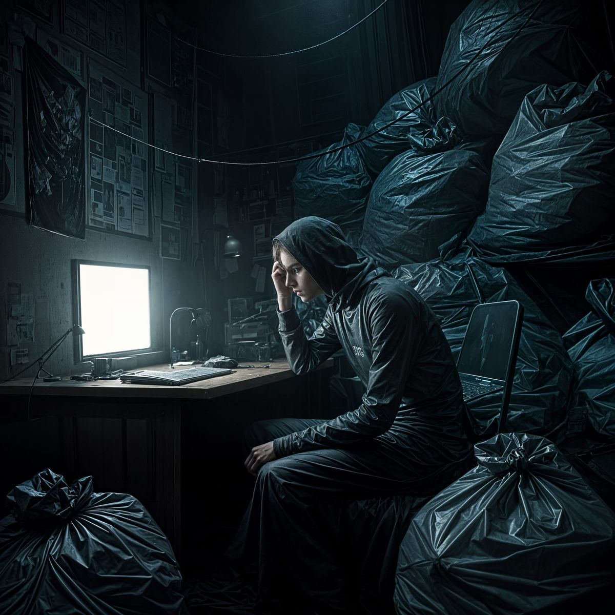 This image shows a dark silhouette of a person sitting by a computer in a room filled with garbage bags, creating a gloomy and sad atmosphere.