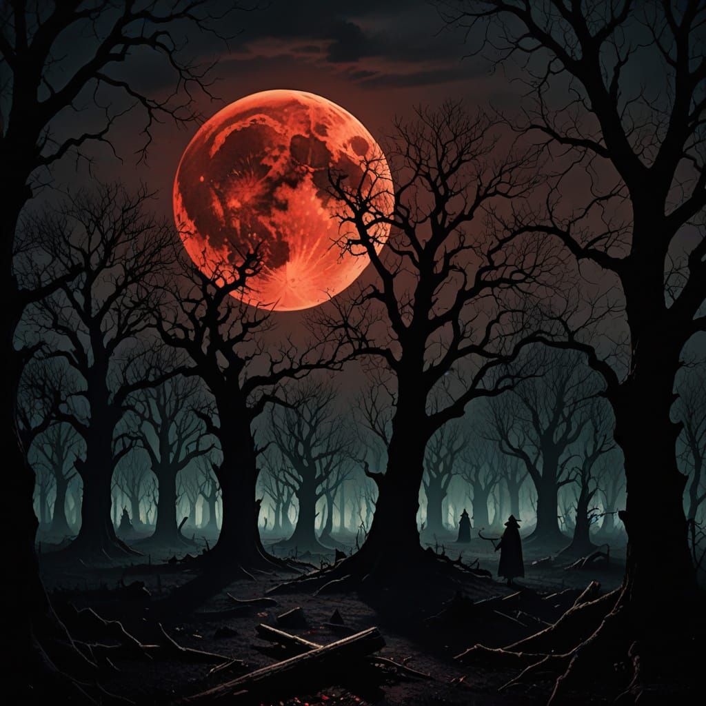 This image depicts a sinister gathering of witches performing a ritual under a blood-red moon. Silhouettes are stark against a stormy sky, with a bonfire's glow adding to the eerie, cinematic atmosphere.