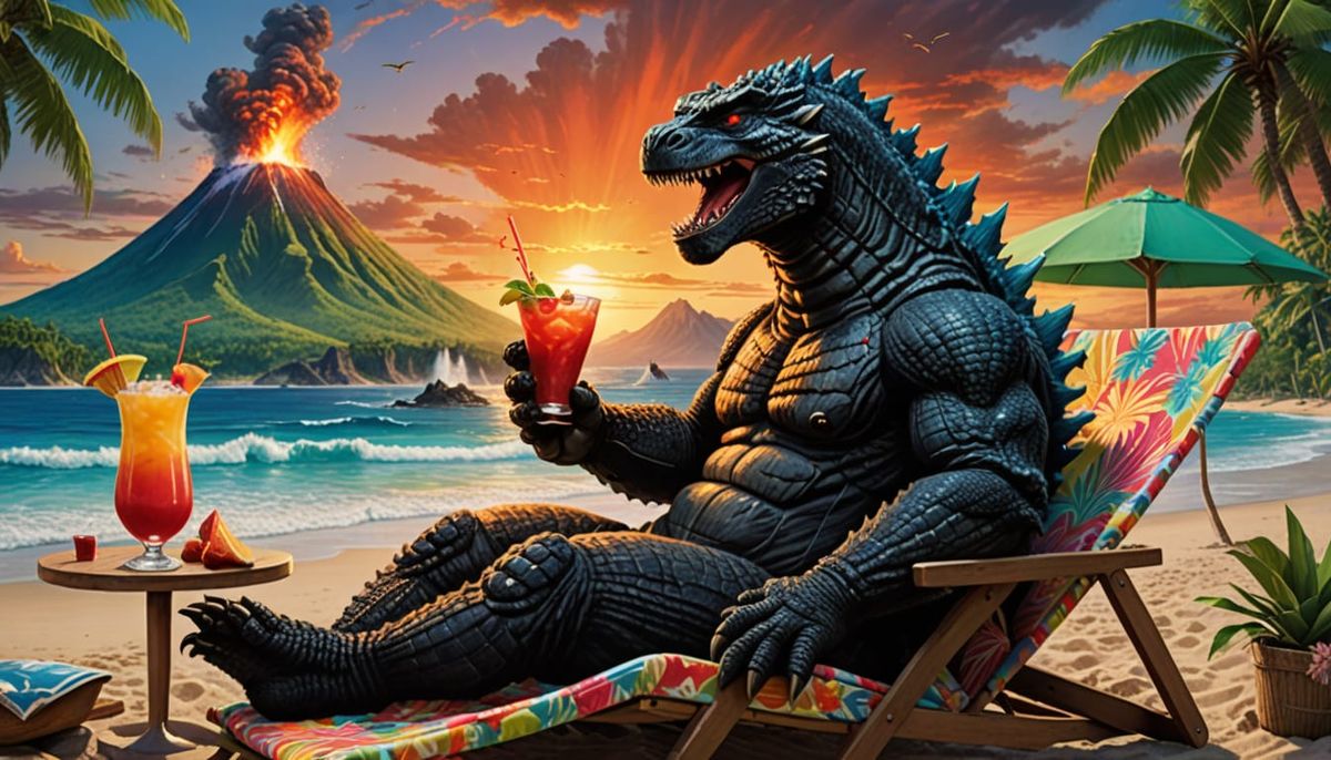 This image shows Godzilla in a Hawaiian shirt, enjoying a cocktail on a beach with distant volcanic islands. A unique depiction of a monster on vacation.