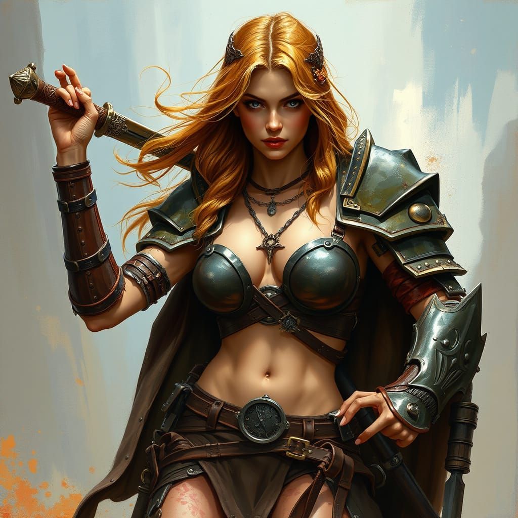 A fantasy image of a bare-chested woman warrior in leather armor and wielding a sword. The artwork features dynamic brushstrokes and a blend of realism and vibrancy reminiscent of classic fantasy art.
