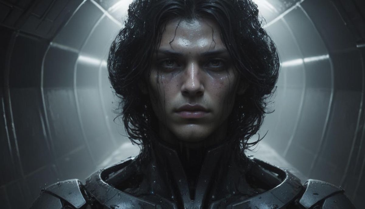 A dark portrait of an android in a grim setting. This image depicts a wet android in a furnace chamber, rendered with moody lighting and an uncanny aesthetic.