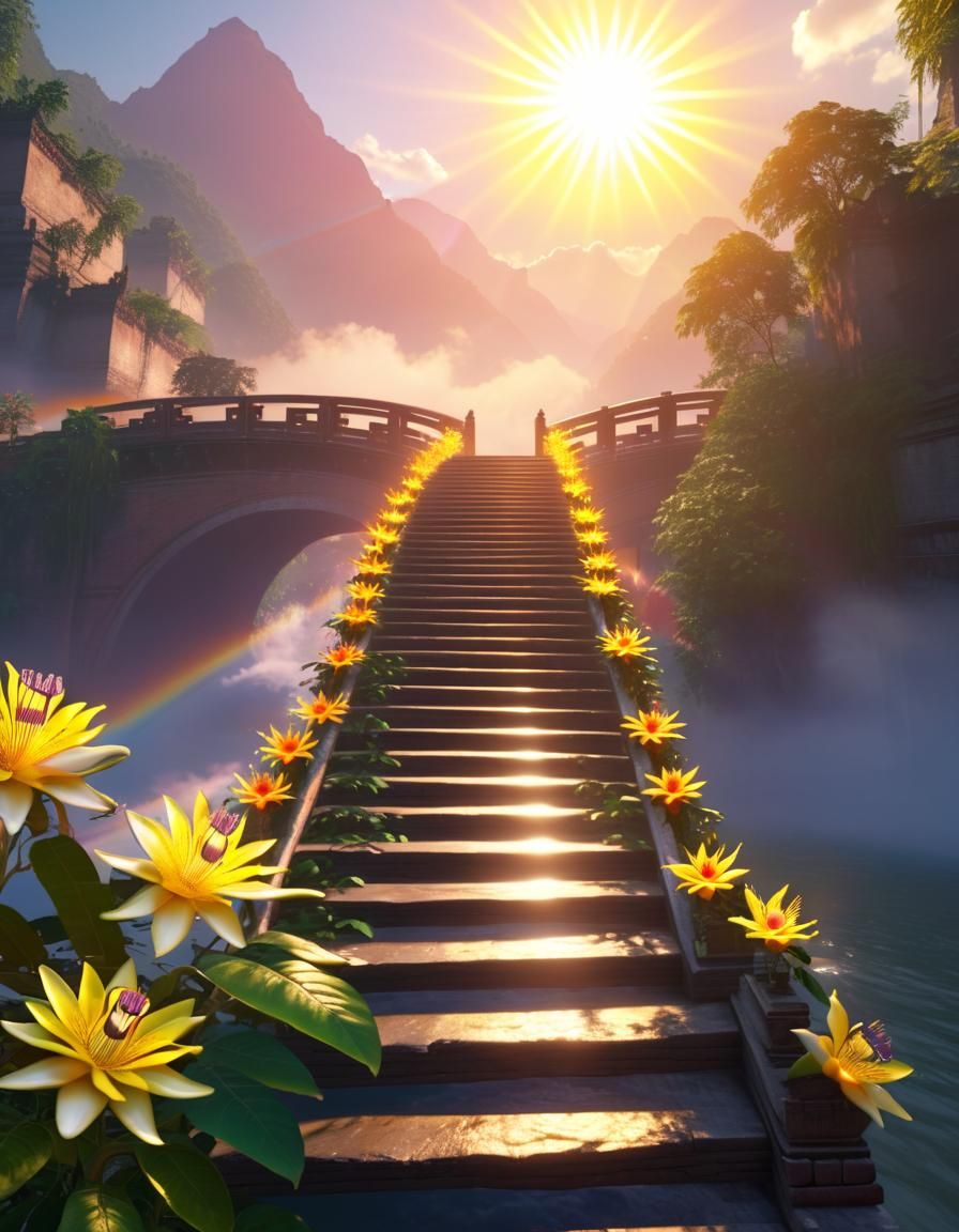 This image shows floating bridges amidst blooming stairs over the Kali River between China and Nepal. The scene features river spirits and flags with heavenly sunshine in a cosmic aesthetic.