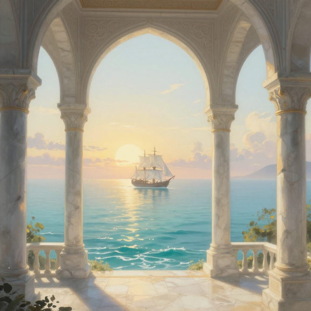 This image depicts Rivendell's white marble arches at sunrise, with an Elven ship sailing towards the horizon. Rendered in a painterly fantasy art style with soft golds, silvers, and blues.