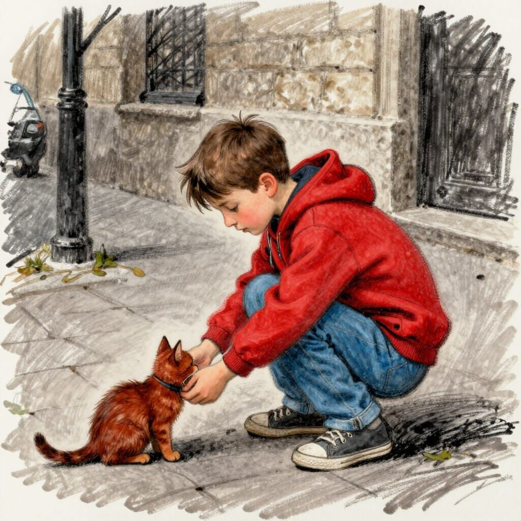 Free and easy AI image generator. Create your own unique images of boys finding cats in the street.