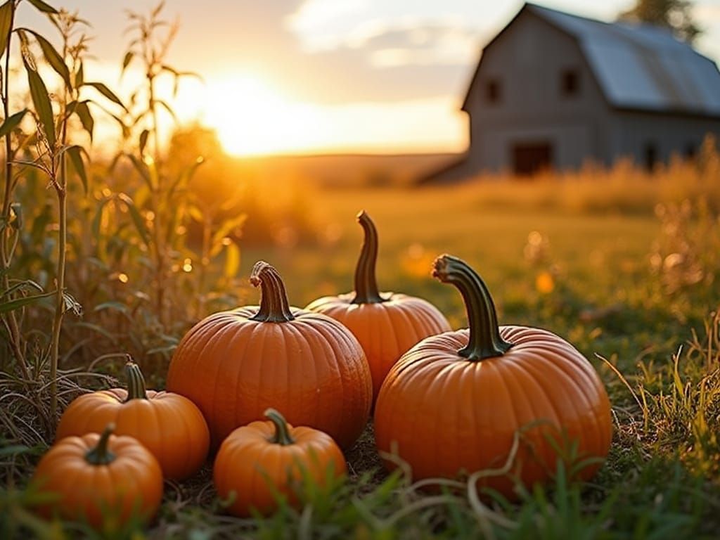 This image captures a picturesque autumn harvest scene bathed in warm golden hour sunlight. It features pumpkins, corn stalks, and a rustic barn with a shallow depth of field.