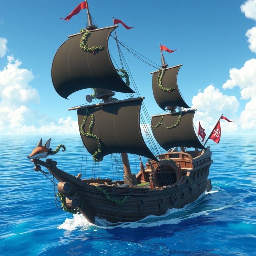 A dramatic view of a black-sailed pirate ship cutting through a bright blue ocean. The ship features vine-covered masts and a fox figurehead, rendered as 3D anime art.