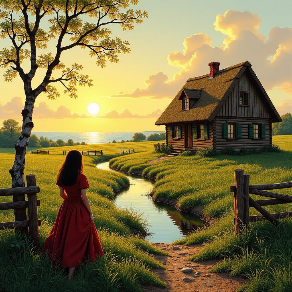 This image shows a woman in a garden by a rustic house at sunset. The scene is surreal and retrofuturistic, with vibrant colors, high contrast lighting, and a 1970s aesthetic.