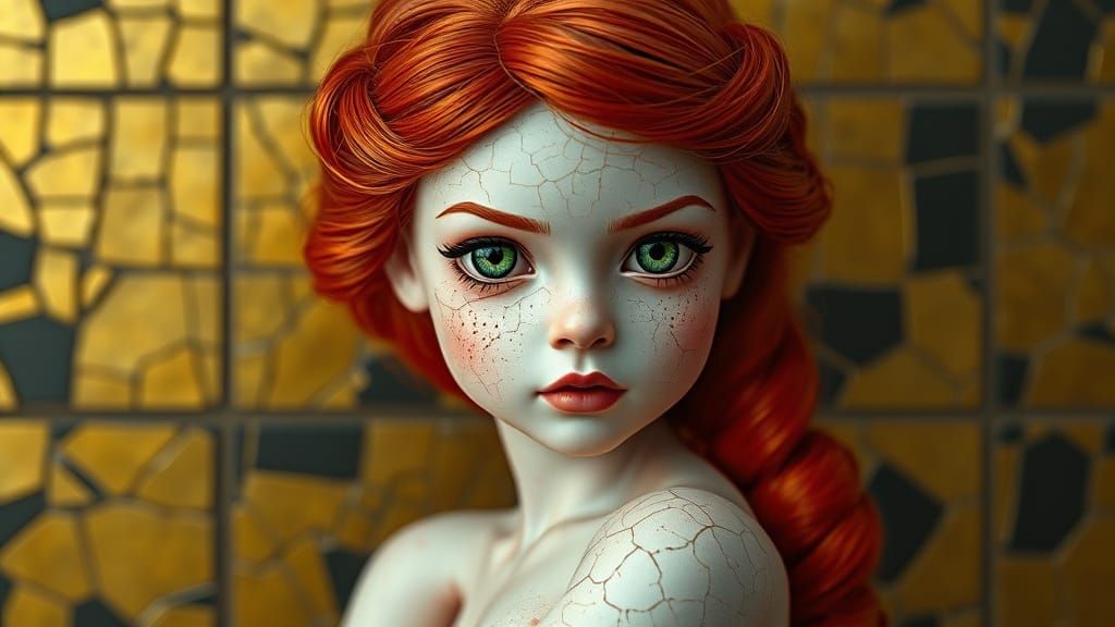 This image shows a cracked porcelain doll with red hair, freckles and green eyes. The doll blends into a vintage gold and black tile background, displaying a serene expression as a digital portrait.