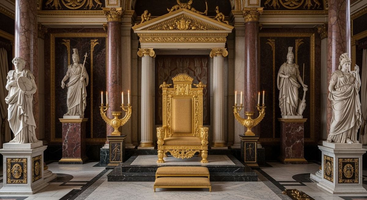 This image shows a lavish Roman throne room filled with gold ornaments and marble statues. The photograph features shallow depth of field and natural lighting, creating a luxurious and detailed scene.