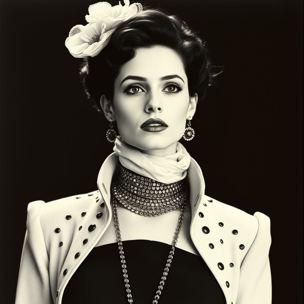 This image showcases a woman in avant-garde fashion, inspired by the expressive and distorted style of Egon Schiele. A striking portrait of bold design.