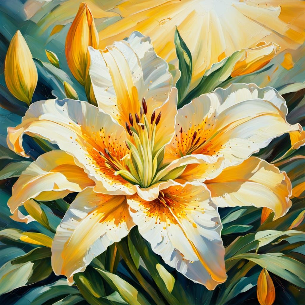 A vibrant oil painting shows a glowing lily in a garden. Macro photography captures the soft petals in warm sunlight, with golden colors and expressive brushstrokes.
