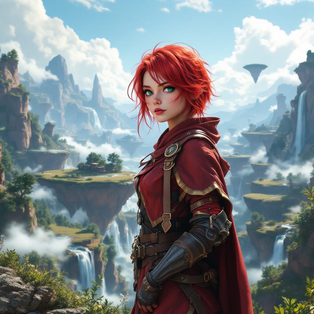 This image shows a young female adventurer with red hair and striking eyes, wearing leather gear and a cloak, standing on a cliff overlooking a fantasy valley. The style is detailed concept art with deep colors.