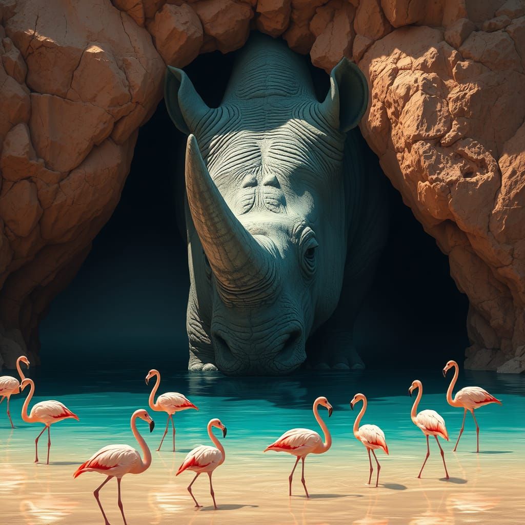 Imagine a hidden oasis in the desert, where a colossal rhinoceros head forms a natural grotto, its rough hide contrasting with the smooth, turquoise water within. Graceful flamingos wade in the shallows, their pink plumage reflected in the serene pond, creating a surreal sanctuary of life amidst the ...