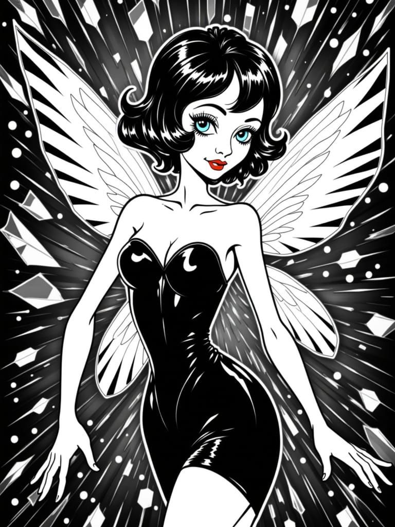This image shows a fairy in a flapper dress dancing in a 1920s nightclub with art deco patterns. The black and white image is in a vintage anime style.